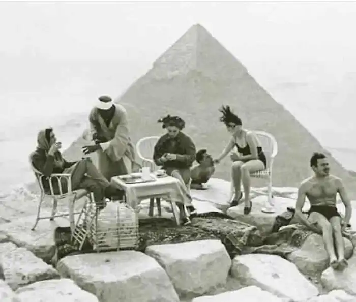 Туристы за чаепитием на Пирамиде Хеопса в Египте, 1938