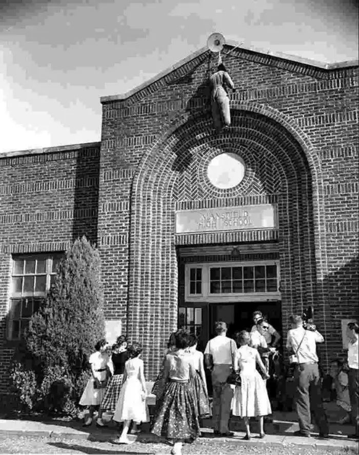 20. Чучело негра перед входом в школу, как протест против интеграции чернокожего населения, Техас, 1956 год
