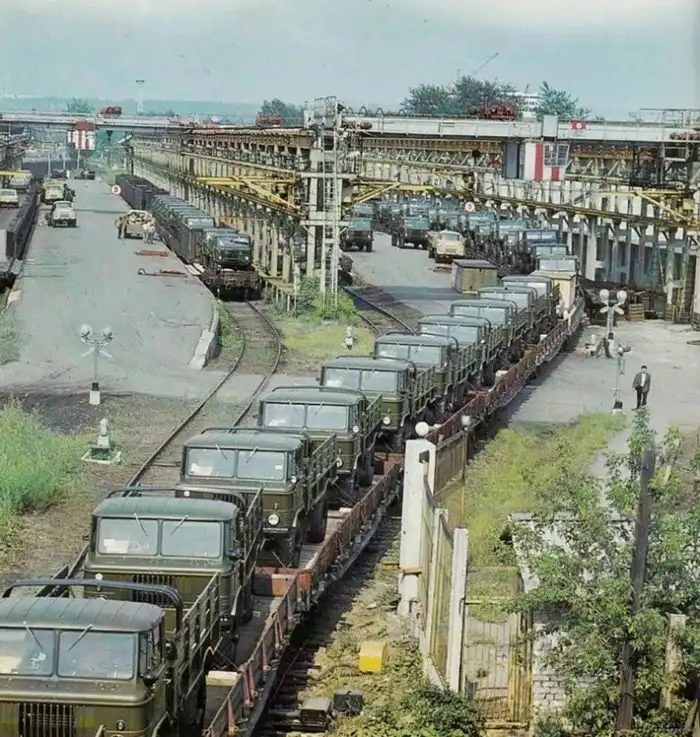 25. Партия готовых грузовиков ГАЗ-66 на железнодорожных платформах отправляются с Горьковского автозавода заказчику. Горький, станция Сортировочная-Автозаводская. СССР. Середина 1970-х