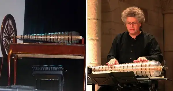 Это крайне редкий музыкальный инструмент, состоящий из стеклянных полусфер, надетых на специальную ось. Был создан в XVII веке. Сегодня встретить стеклянную гармонику на концертах практически невозможно.