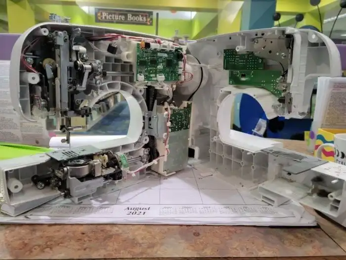 У моей подруги сломалась швейная машинка, поэтому она разобрала ее и починила. К счастью, она сделала этот потрясающий снимок