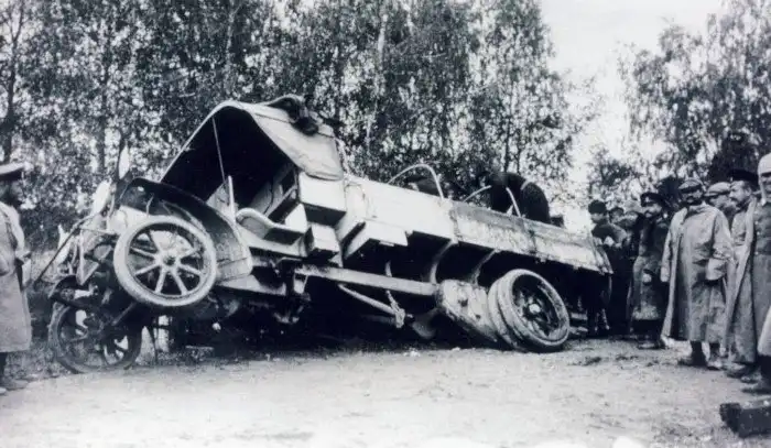 8. Авария немецкого грузовика Adler L 35PS под Орлом во время второго в России испытательного пробега военных грузовиков, 1912 год
