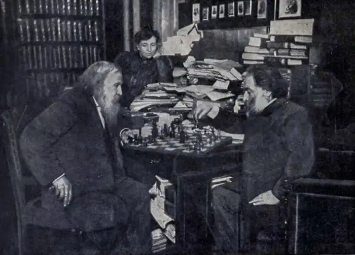 12. Дмитрий Иванович Менделеев играет в шахматы с Архипом Ивановичем Куинджи. 1904 год