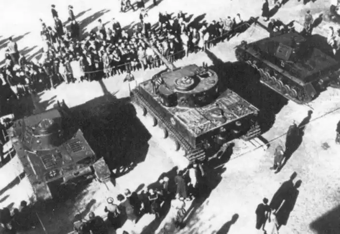 13. Немецкие танки на выставке трофейного вооружения в ЦПКиО имени Горького. 1943 год