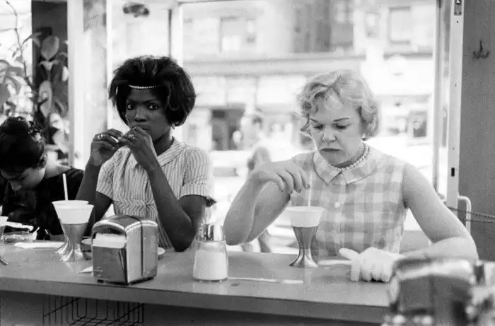 20. Белая женщина, всем своим видом выражает свое недовольство тем фактом, что рядом с ней за стойкой кафе устроилась черная девушка. США, 1962 год