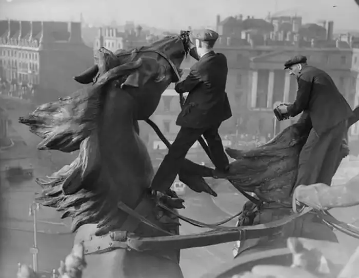 12. Рабочие проводят чистку статуй лошадей на вершине Арки Веллингтона. Лондон, 17 января 1939 года