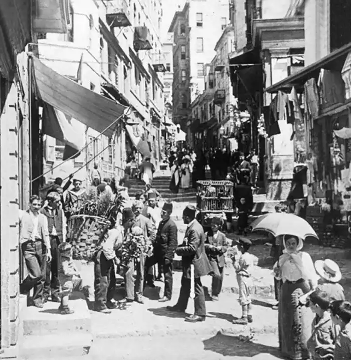 20. Магазины и люди на узкой ступенчатой улице в Пере, Константинополь