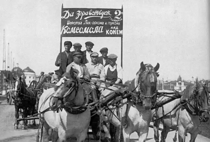 21. Тройка транспортных лошадей Ленинградского союза потребительских обществ во время парада на ипподроме (ул. Марата, 90). 1934 год