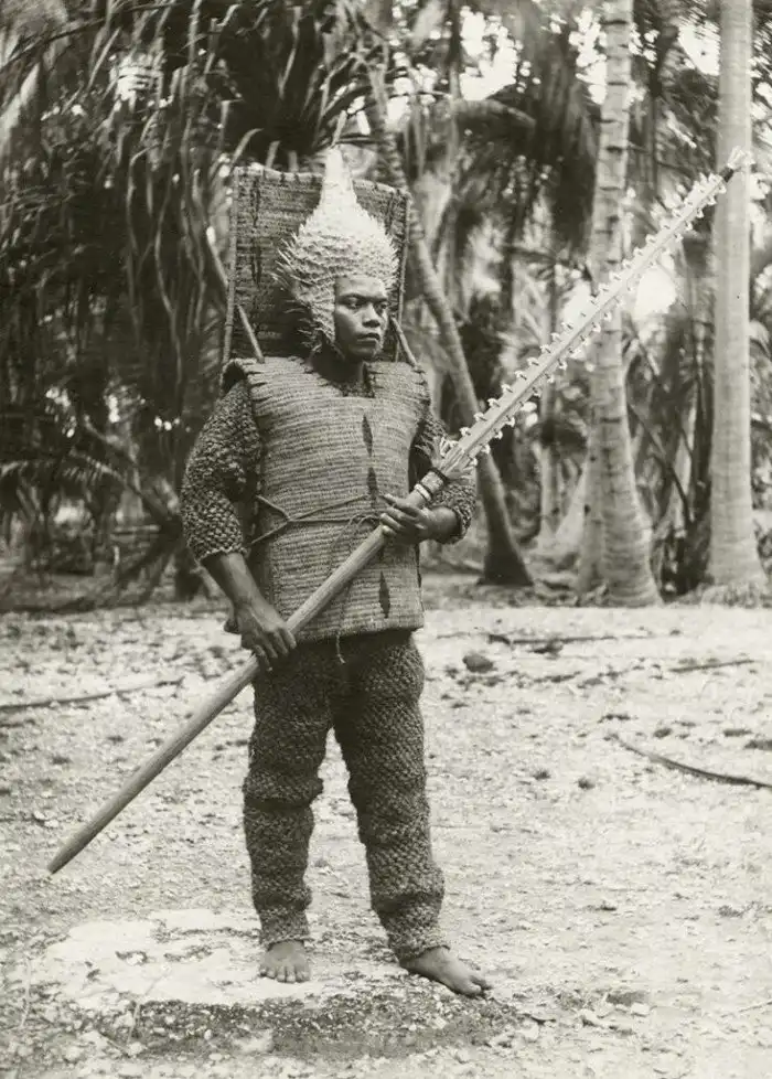 Мужчина в традиционных доспехах Кирибати, около 1925 года