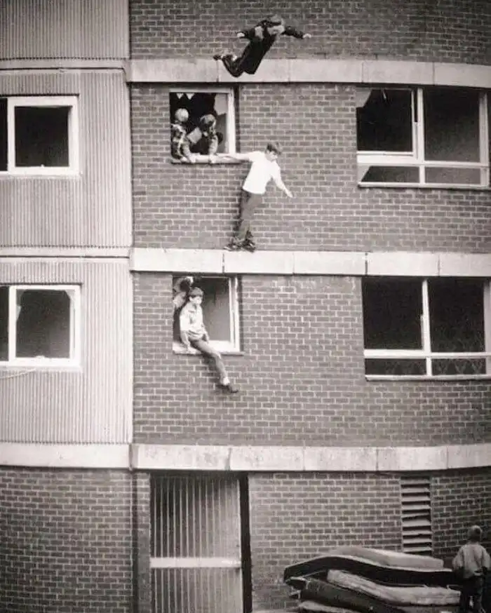 Дети прыгают на старых матрасах, Англия, восьмидесятые