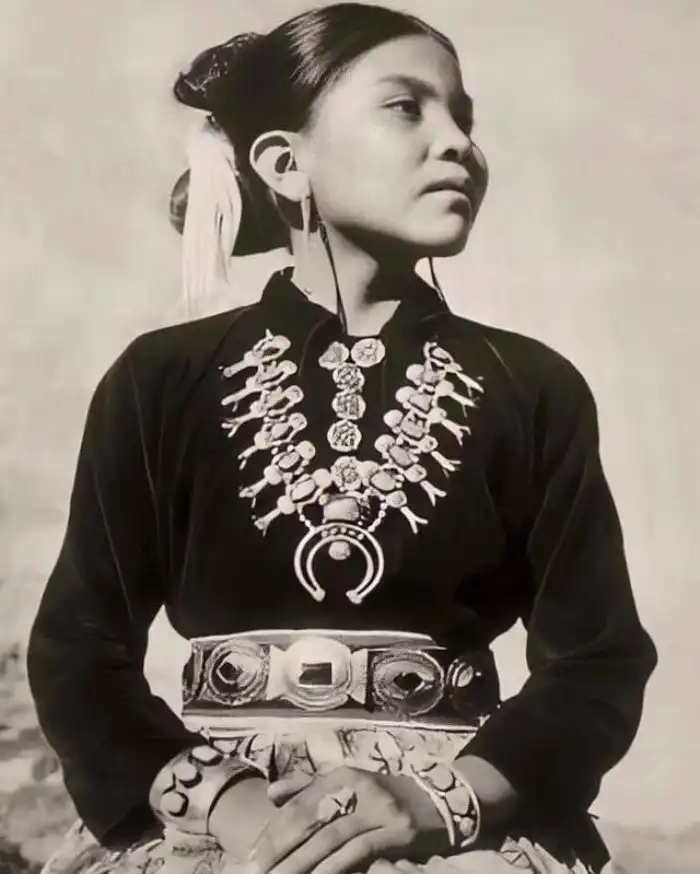Девушка из племени навахо в серебряных и бирюзовых украшениях, 1950 год