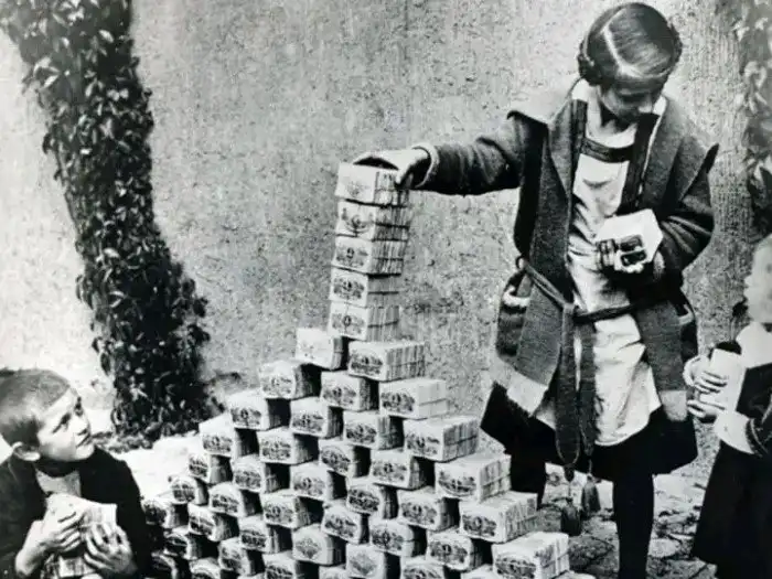 Дети играют пачками обесценившихся из-за войны денег, Веймарская Республика (Германия), 1923 год