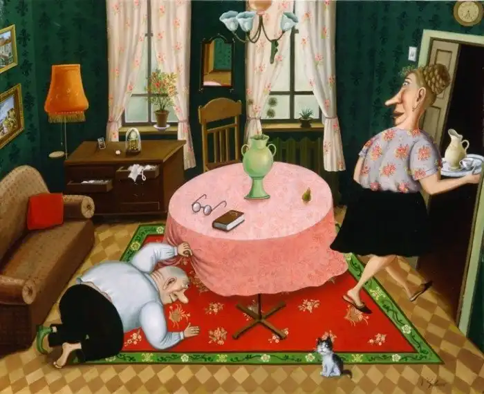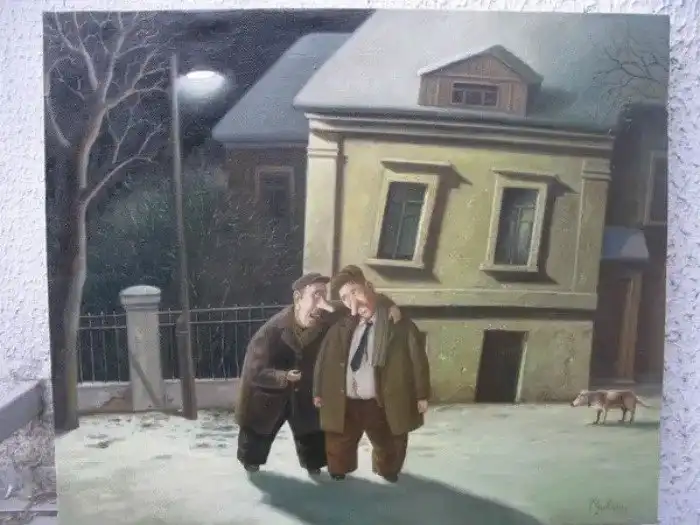 Правдивые они потому, что художник изображает только то, что помнит сам, своё детство, традиции, усвоенные с юношества, а ироничные, потому что артист приправил каждую работу долей юмора и доброты. Его полотна хочется рассматривать, ведь они искренние, тёплые и такие родные.