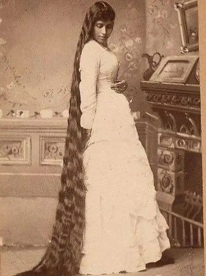 23. Викторианская девушка с очень длинными волосами на модном фото 1890-х годов