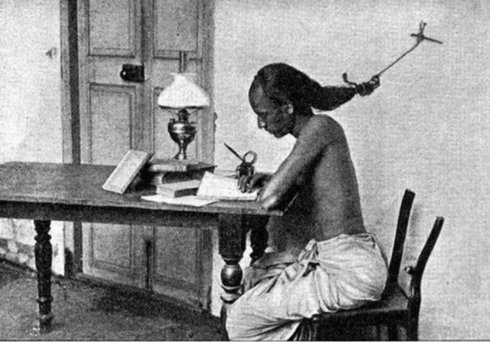 Индийский студент-брамин (класс священника) Мадрасского университета, его волосы привязаны к гвоздю в стене, чтобы он не заснул, 1948 год