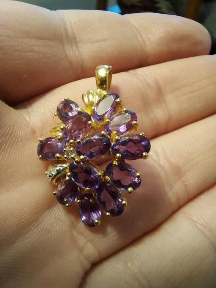 Маленький кулон из 14-каратного золота с 12 аметистами и 3 бриллиантами. Заплатила 1 доллар