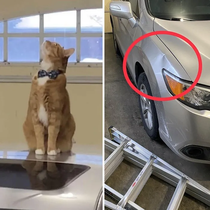 «Мой кот забежал в гараж, сел на крышу моей машины, затем опрокинул лестницу, которая помяла мою машину»
