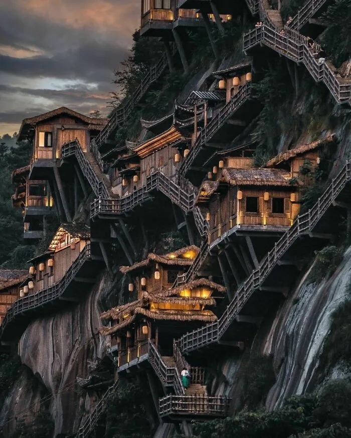 8. Долина Вансянь с домами, висящими на скале. Лилин, провинция Хунань, Китай