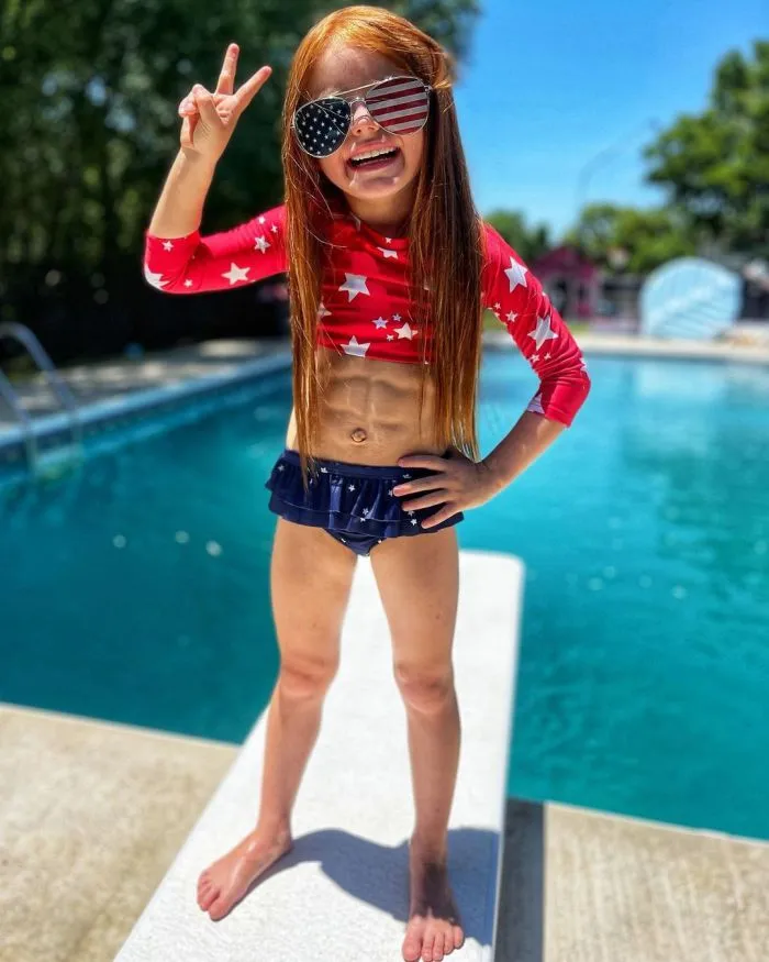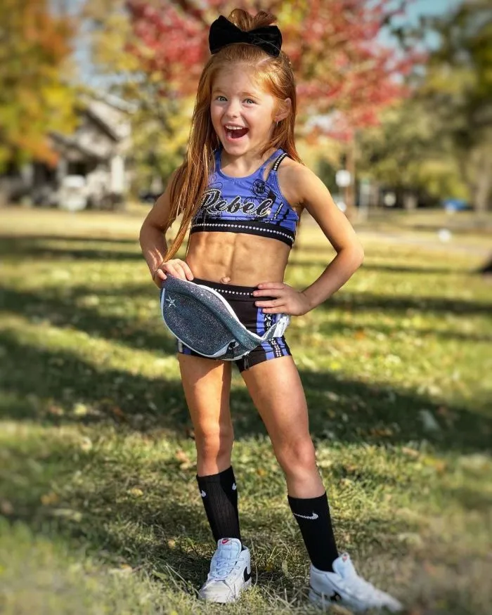 Кубики пресса на животе малышки вызывают немало споров в сети, люди пишут, что девочка выглядит слишком взрослой для своего возраста, и родители не дают ей оставаться ребёнком.