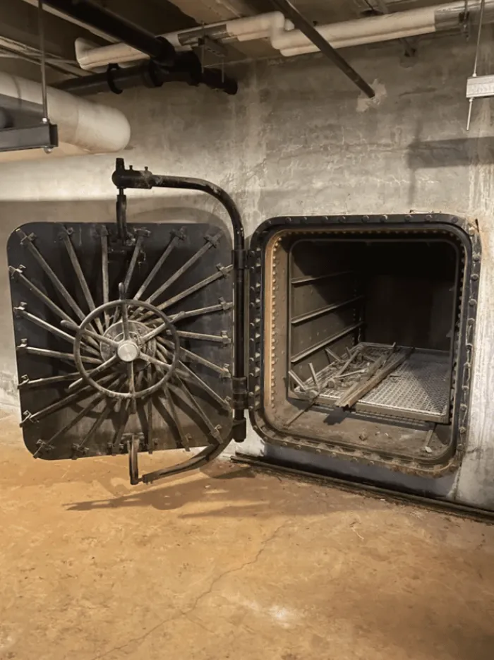 Это большой автоклав. Устройство используется для стерилизации матрасов и постельных принадлежностей.
