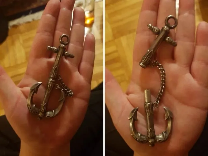 Изделие в форме якоря из серебра. Полое внутри, открывается и закрывается