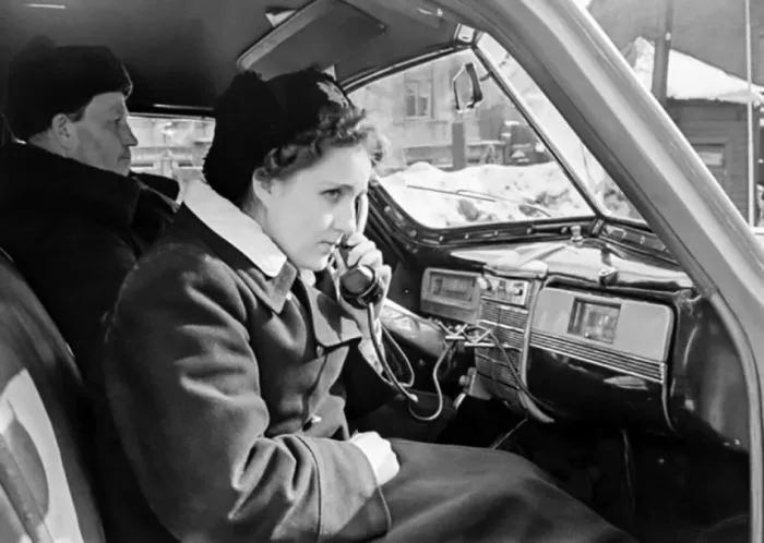 22. Фельдшер Круглова принимает вызов по радио-телефону от диспетчера Центрального городского пункта неотложной помощи апрель 1958 год