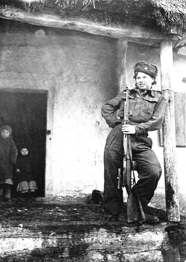34. Снайпер чехословацкого батальона Валентина Биньевска на крыльце дома со своим оружием — винтовкой СВТ-40, оснащенной оптическим прицелом. Бузулук Оренбургская область, СССР. 1942 год