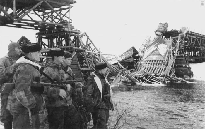 35. Группа подрывников из партизанского отряда имени Хрущева у взорванного моста на Украине. Январь 1944 год