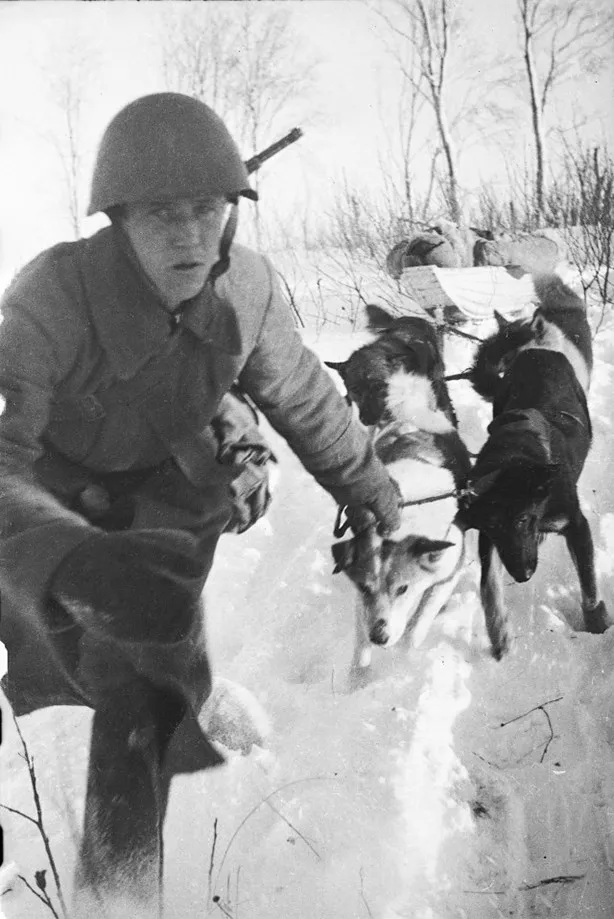 37. Советский санитар управляет собачьей упряжкой, везущей на волокуше раненого под Ржевом. Калининский фронт. 1942-1943 гг.