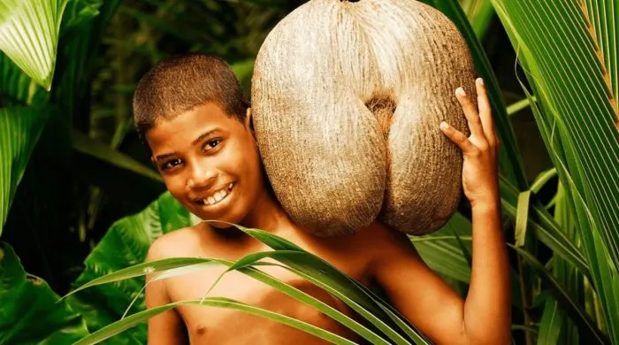 Это семечко редкого вида сейшельской пальмы (Lodoicea maldivica), которая растёт только на двух островах Сейшельского архипелага. Больше нигде в мире её отыскать нельзя. Семена этого дерева считаются самыми большими из всех растений и могут весить до 25 килограммов.