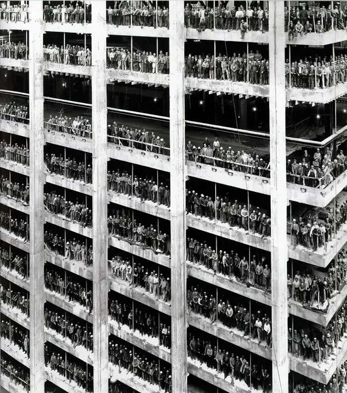 9. Более 3000 рабочих, участвовавших в возведении Chase Manhattan Bank в Нью-Йорке, позируют для фотографии по завершении строительных работ, август 1964 года