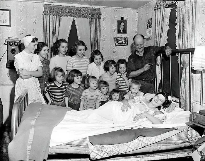 18. Тринадцать сестер из семьи Брукс смотрят на своего единственного брата Лесли Бенджамина после его рождения дома в Питтсфилде, штат Массачусетс, 1954 г.