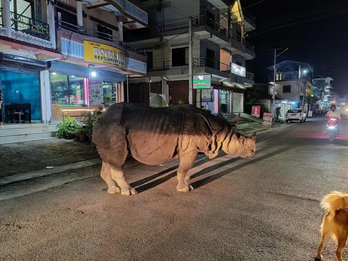 9. Носорог на прогулке по улицам Саурахи, Непал