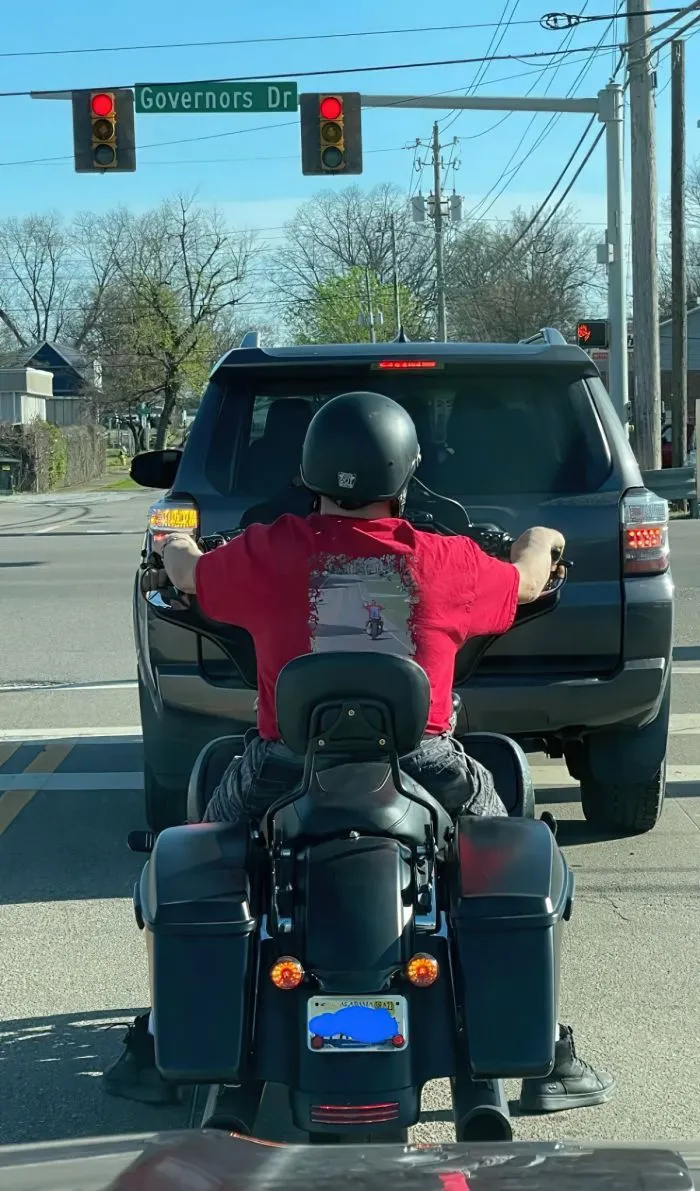 17. «Чувак на мотоцикле одет в футболку с изображением того, как он едет на мотоцикле»