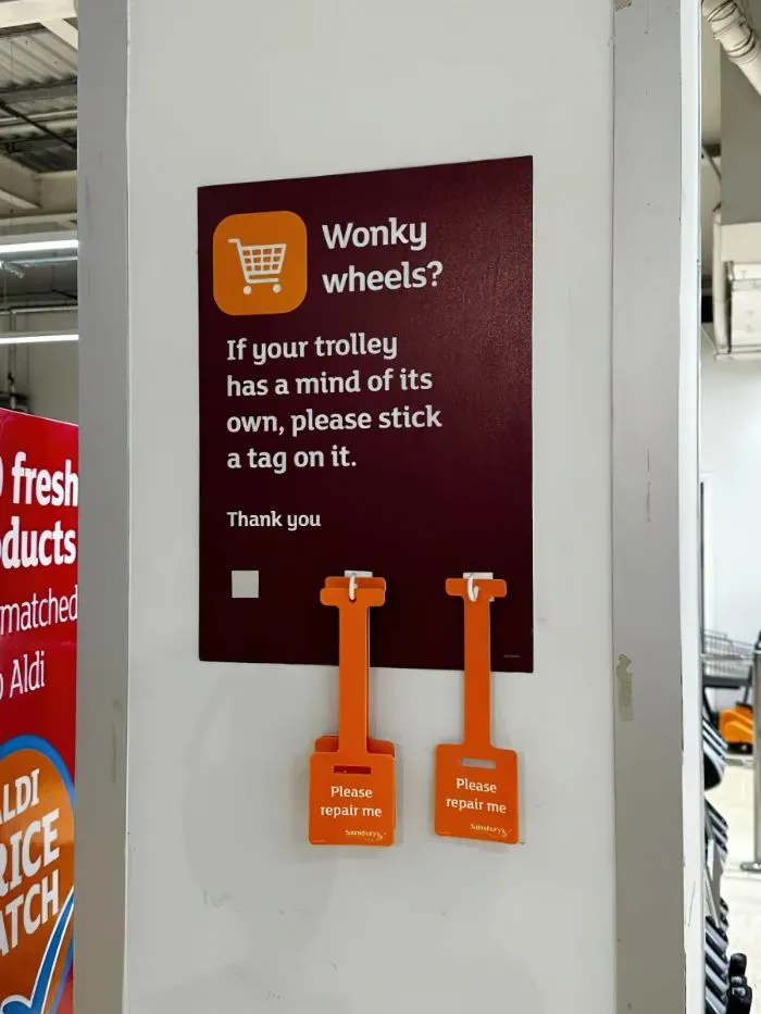 18. «Стенд со специальными бирками в британском супермаркете. Бирку можно прицепить на тележку с расшатанными колёсами, нуждающуюся в ремонте»