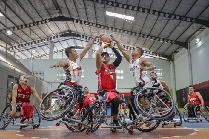 Национальная сборная Индонезии тренируется перед паралимпийскими соревнованиями по баскетболу. Снимок сделан 9 сентября 2022 года.