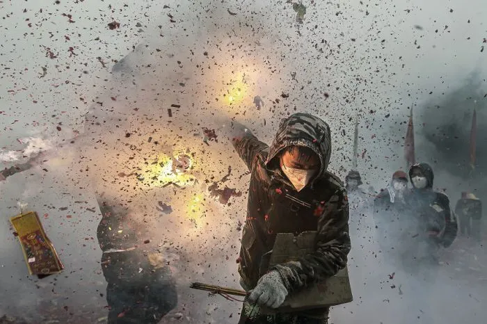 Снимок сделан в уезде Дэцин, город Чжаоцин, Китай. Во время праздника китайцы бросают петарды в фигуры львов, что символизирует изгнание демонов и злых духов.