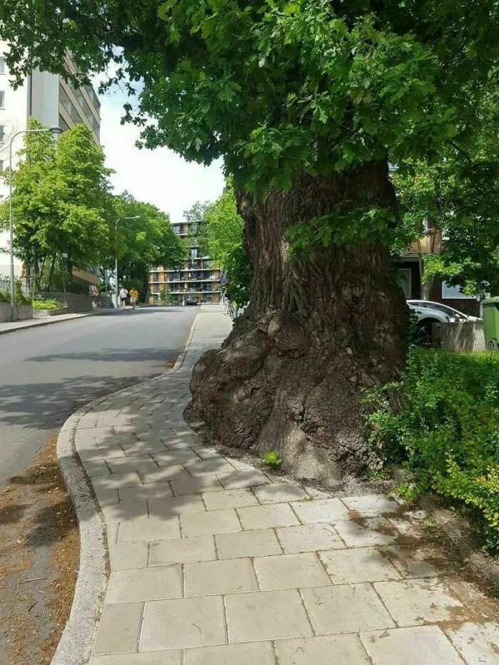 Тротуар, проложенный в обход старого дерева в Стокгольме