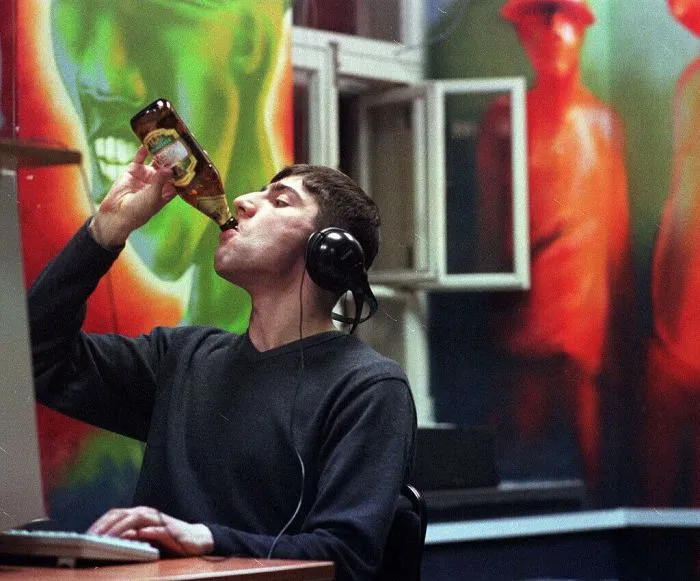 20. Парень пьёт пиво «Золотая бочка» в интернет-клубе «Нирвана». Москва, 2000 год.