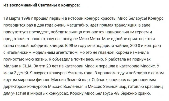 В 1997 году по поручению Президента Александра Лукашенко приказом Министерства культуры в Минске создали Национальную школу красоты. Главными целями на момент создания стали проведение первого конкурса «Мисс Беларусь» и дальнейшее участие победительниц в международных соревнованиях красавиц. Конкурс впервые прошел в марте 1998 года: нет, частные шоу, где выбиралась самая прекрасная девушка, были и раньше, а вот на государственном уровне подобное событие состоялось впервые.