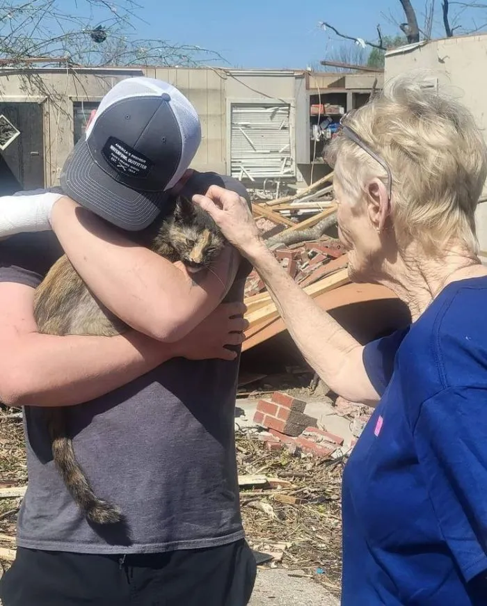 Семья думала, что потеряла всё после торнадо, но вернувшись к обломкам своего дома, они увидели своего кота, который ждал их там
