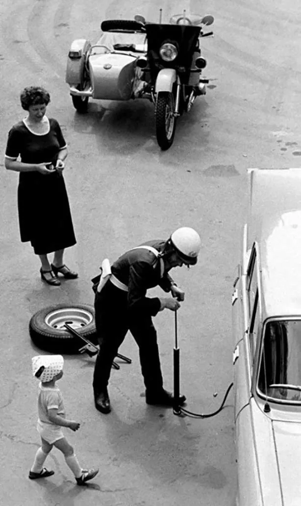 34. Инспектор ГАИ оказывает женщине-водителю помощь на дороге, 1981 год