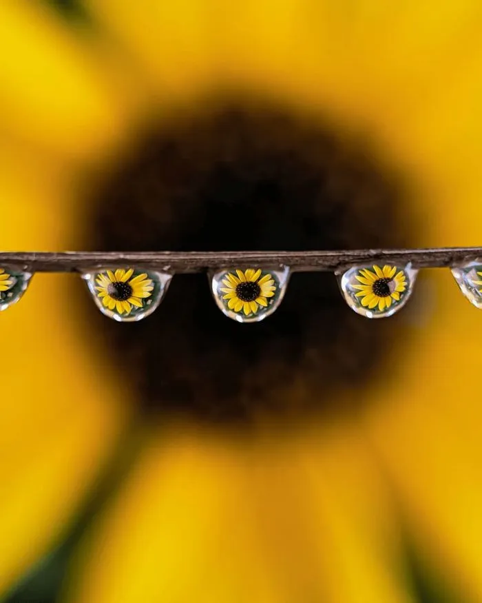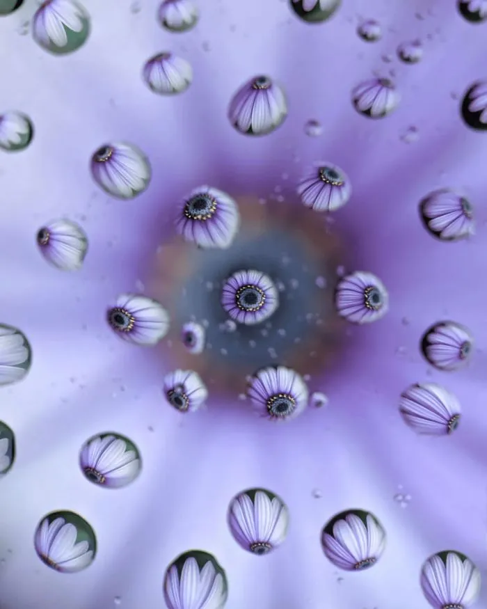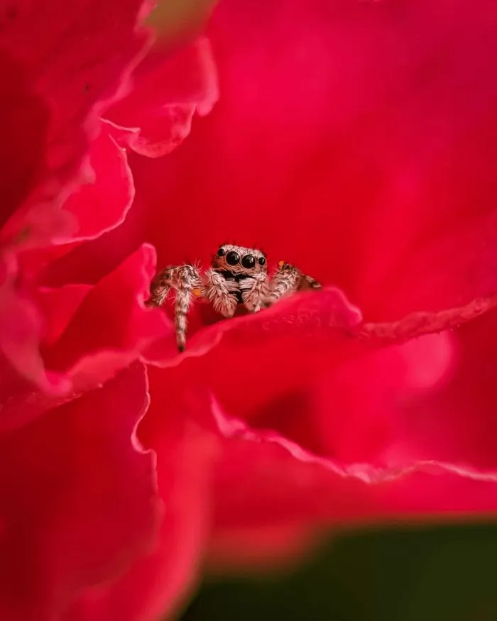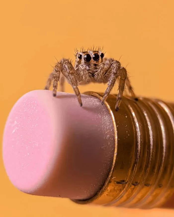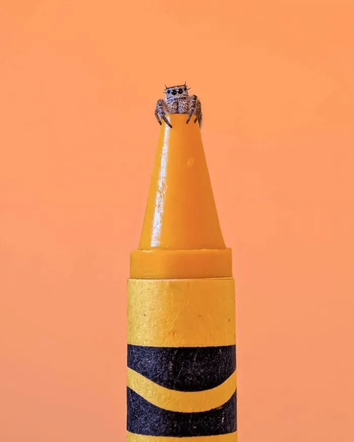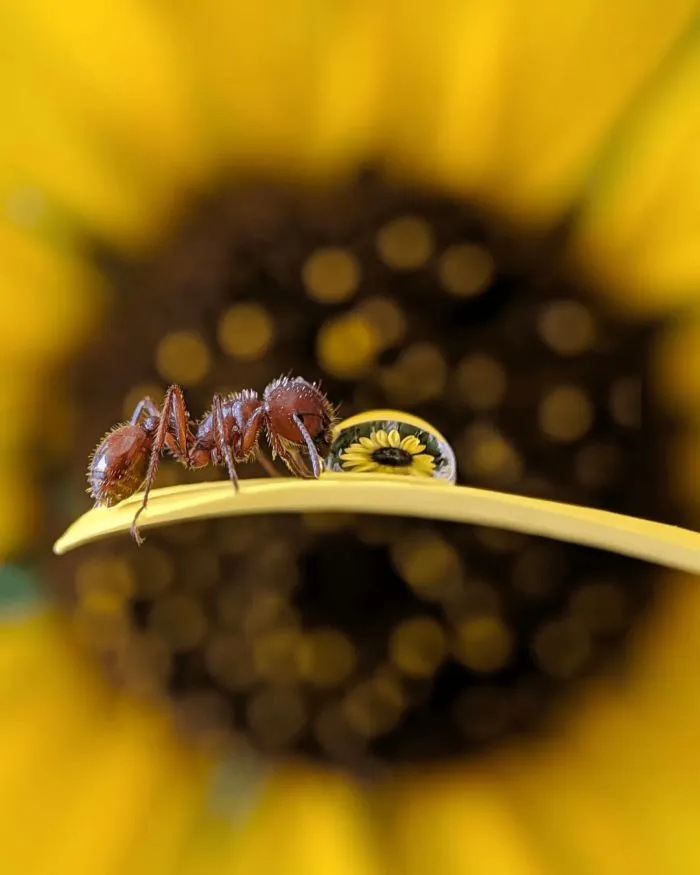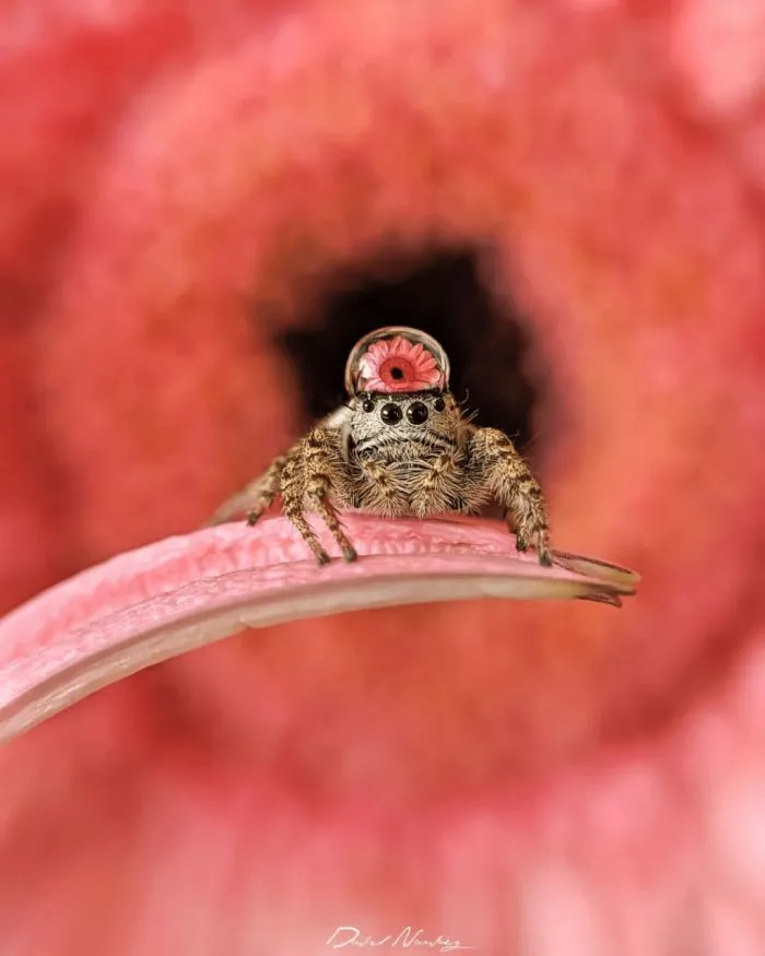 Особенно сильно художник любит играться с каплями воды и отражениями в них, создавая красочные иллюзии, и фотографировать крошечных паучков, демонстрируя их выдающуюся маленькость на фоне привычных нам предметов.
