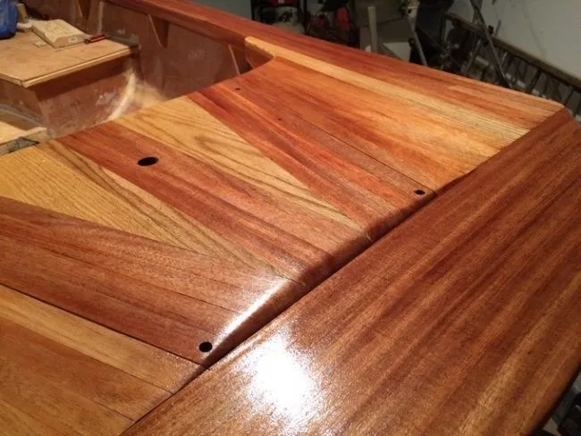 Когда парень пошёл учиться в колледж, работа над лодкой замедлилась. Здесь отец и сын закрепляют на лодке африканское красное дерево: