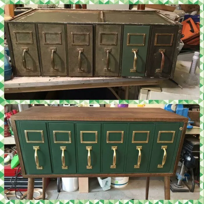 6. «Нашел на свалке часть картотеки. Тщательно очистил, покрасил, отполировал и обшил древесиной из своих запасов. Добавил ножки и вуаля!»