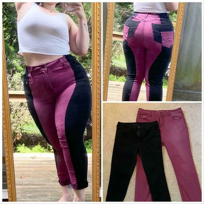 16. «Сшила эти двухцветные брюки из старых брюк с протертой промежностью и другой пары из комиссионки, которая мне не подошла»