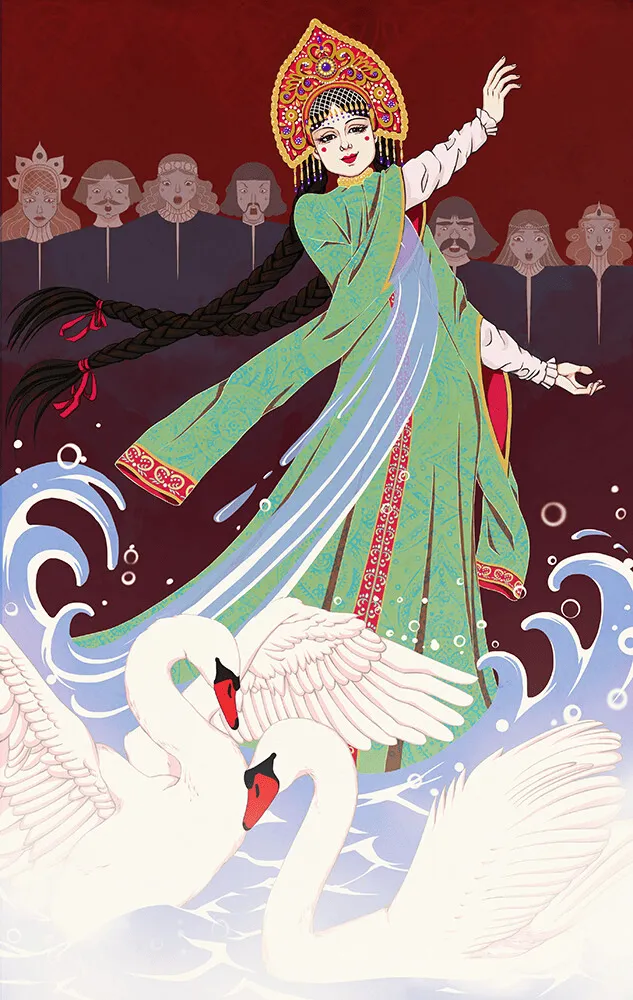 Махнула левым рукавом — стало озеро, махнула правым — поплыли по озеру белые лебеди.