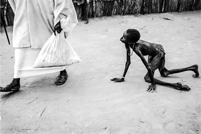 7. Изнеможённый от голода мальчик ползёт за взрослым с мешком еды. Судан, 1998 год