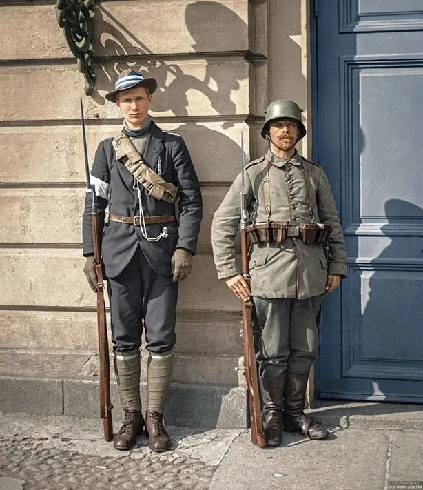 14. Немецкий солдат и финский белогвардеец возле театра в Хельсинки, 19 апреля 1918 года