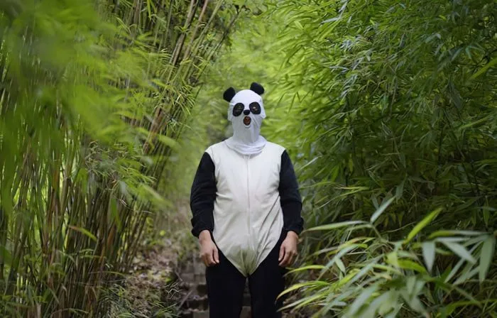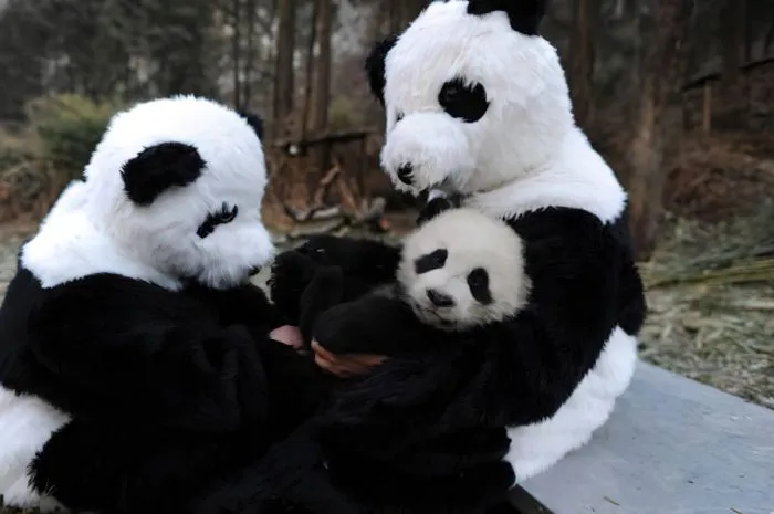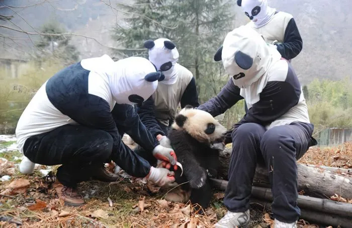 10. Смотрители заповедника панд в Китае маскируются, чтобы не спугнуть детёнышей и помочь им привыкнуть к жизни в природе